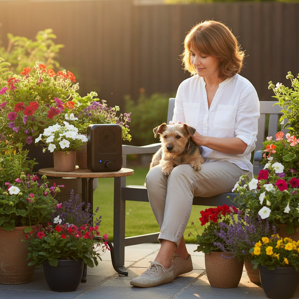 Humane ultrasonic technology interrupts barking the moment it starts. Your dog hears the sound (you can't), stops barking, you reward the quiet. They learn fast. No shock. No spray. No trauma.